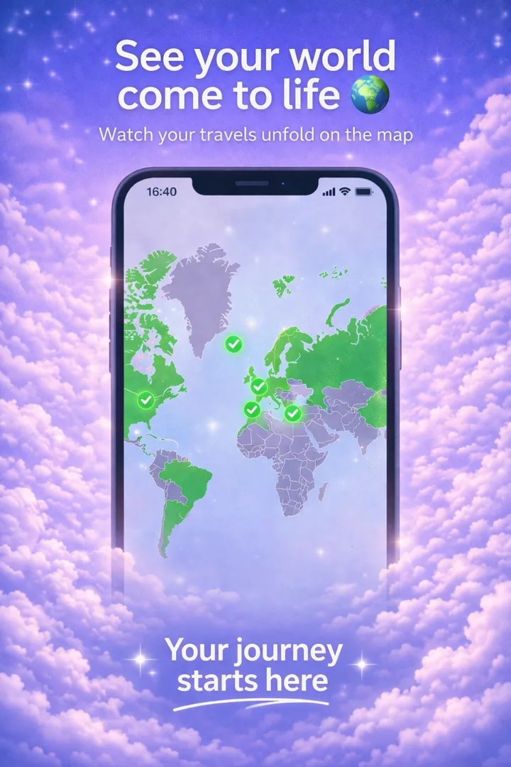 Behalte deinen Fortschritt live im Blick — besuchte Länder, bereiste Kontinente, zurückgelegte Strecke. Klare Diagramme, die sich in dem Moment aktualisieren, in dem du ein neues Land auf der Karte antippst.